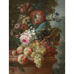 Vase de fleurs et fruits sur un entablement devant un paysage