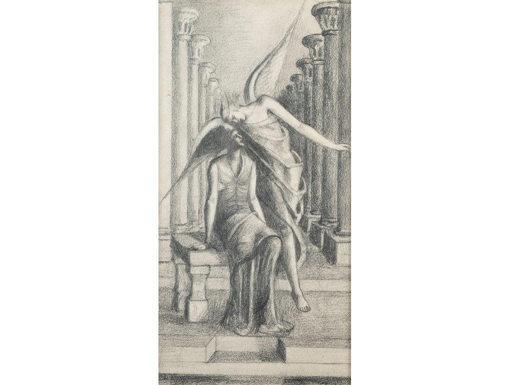 In The Annunciation, a winged figure leans towards a seated woman within an architectural setting structured by monumental columns. The gesture, restrained and suspended, suggests a silent form of communication, without dramatic effect.