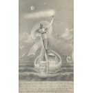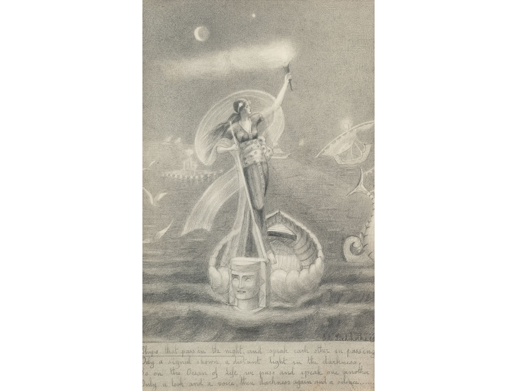 In The Messenger of the Night, a female figure stands on a stylised vessel, holding a light source that pierces the darkness of a marine landscape. The scene is accompanied by a handwritten text drawn from The Theologian’s Tale: Elizabeth by Henry Wadsworth Longfellow, establishing an explicit link between poetry and image and lending the work an introspective dimension.