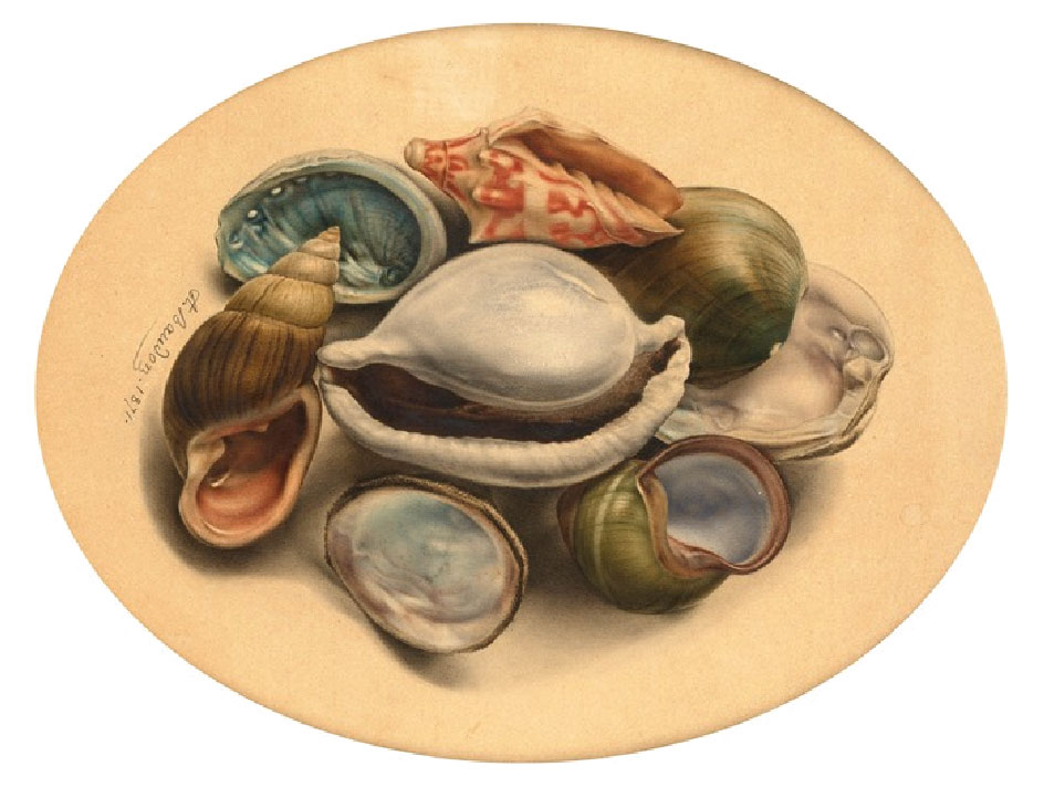 This composition brings together several shells depicted with marked morphological precision. The drawing combines pen work, used to clearly define contours and structural features, with watercolour and brown wash highlights that convey volume, texture, and surface variations. This type of representation is consistent with the common practices of nineteenth-century malacologists, who produced handwritten or watercoloured drawings to document their observations, either as a complement to scientific notes or in preparation for publication.Read more
