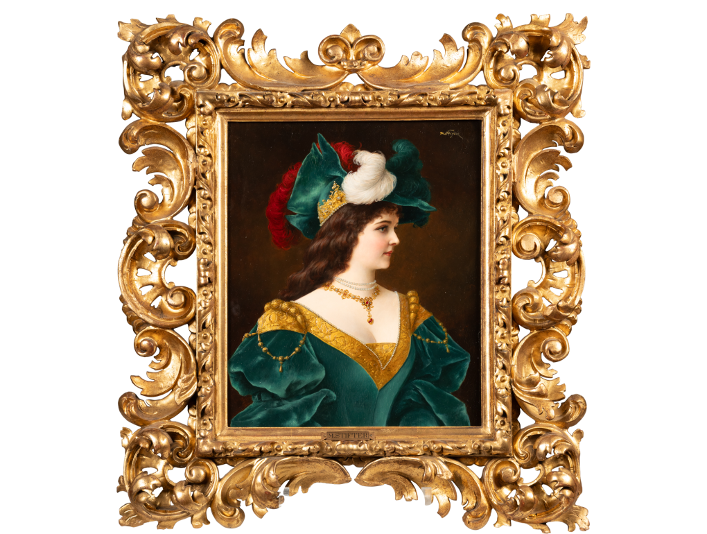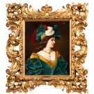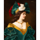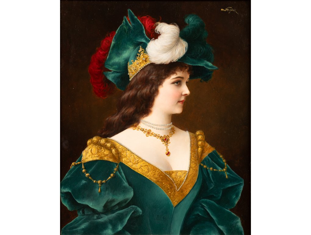 This portrait by Moritz Stifter reflects the fashion for “fantasy portraits” that flourished in Europe during the second half of the 19th century. The young woman, shown in profile, wears a sumptuous Renaissance costume in emerald green velvet, embellished with pearls, gold embroidery, a pearl necklace and a ruby pendant. Her attire is crowned with an imposing tiara adorned with stones and multicoloured feathers.Read more