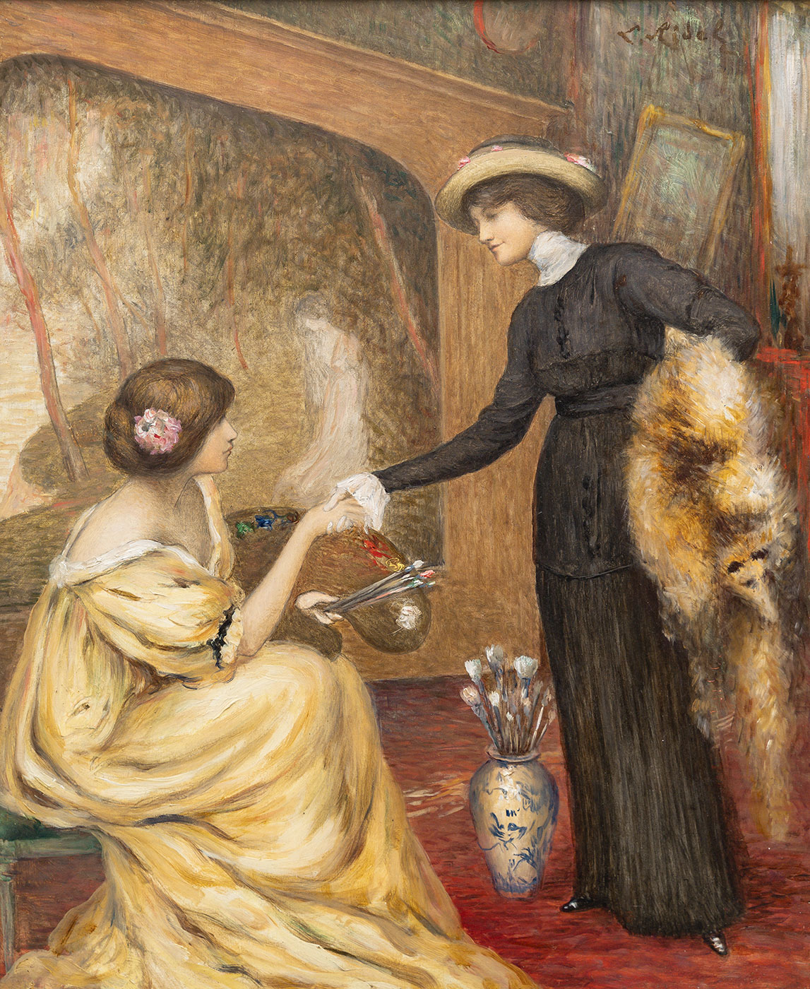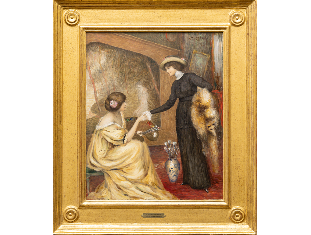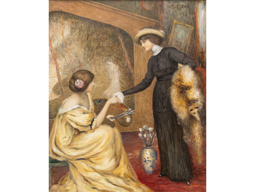 In this composition, Louis Ridel offers an intimate reflection on creation and transmission. Two women embody complementary figures: the artist, focused and holding her palette, and the muse or pupil, extending her hand in a gesture of acknowledgment. The scene, marked by restraint and balance, transcends the simple setting of the studio to become a metaphor for the dialogue between inspiration and realization, a theme dear to the Symbolists.Read more