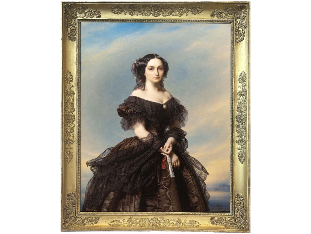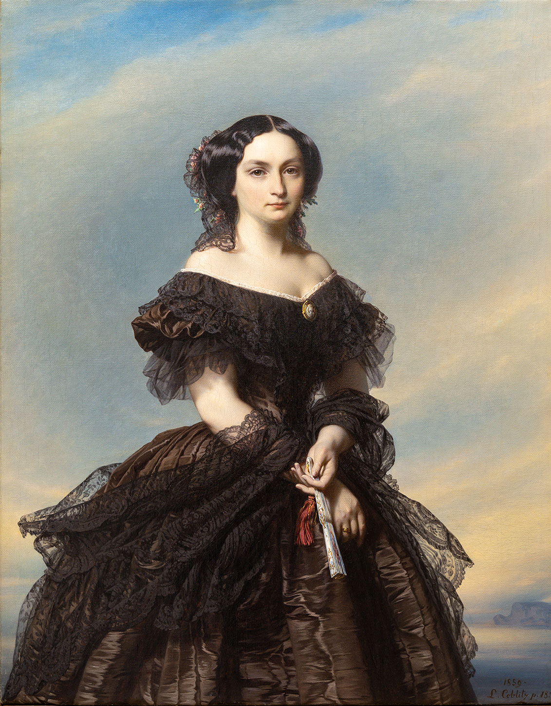 This portrait of a young woman in a brown silk gown trimmed with black lace exemplifies the technical mastery and refined sensibility of Louis Coblitz, one of the most elegant German portrait painters of the mid-nineteenth century. The artist combines academic precision with romantic grace: the delicately modeled face stands out against a luminous sky in soft shades of blue and gold. Her direct gaze and composed pose convey an ideal of beauty marked by poise and distinction. The meticulous rendering of textures — the transparency of lace, the sheen of satin, the smoothness of the skin — reveals Coblitz’s acute eye for detail. The hand holding a fan adds a touch of intimacy and naturalness. Dated 1850, this work belongs to the artist’s mature period, shaped by his training in Munich and Paris, where he blended German precision with the refinement of French Salon portraiture.