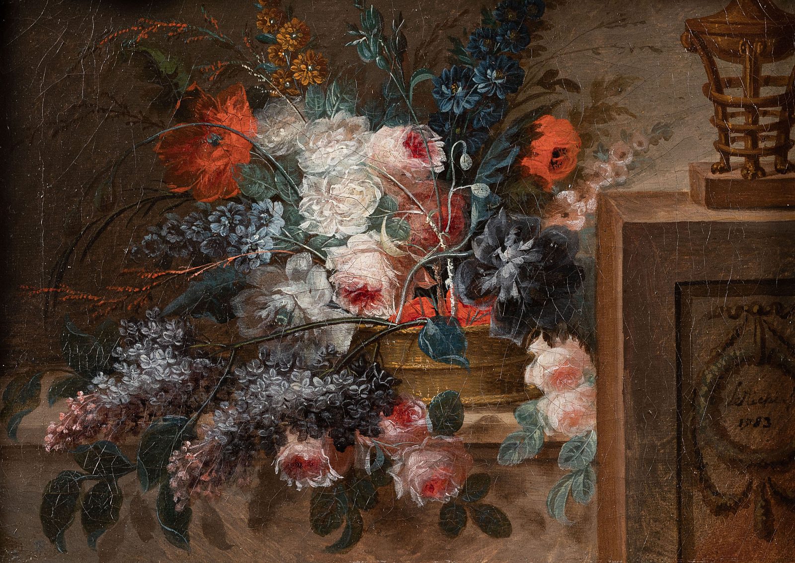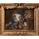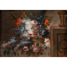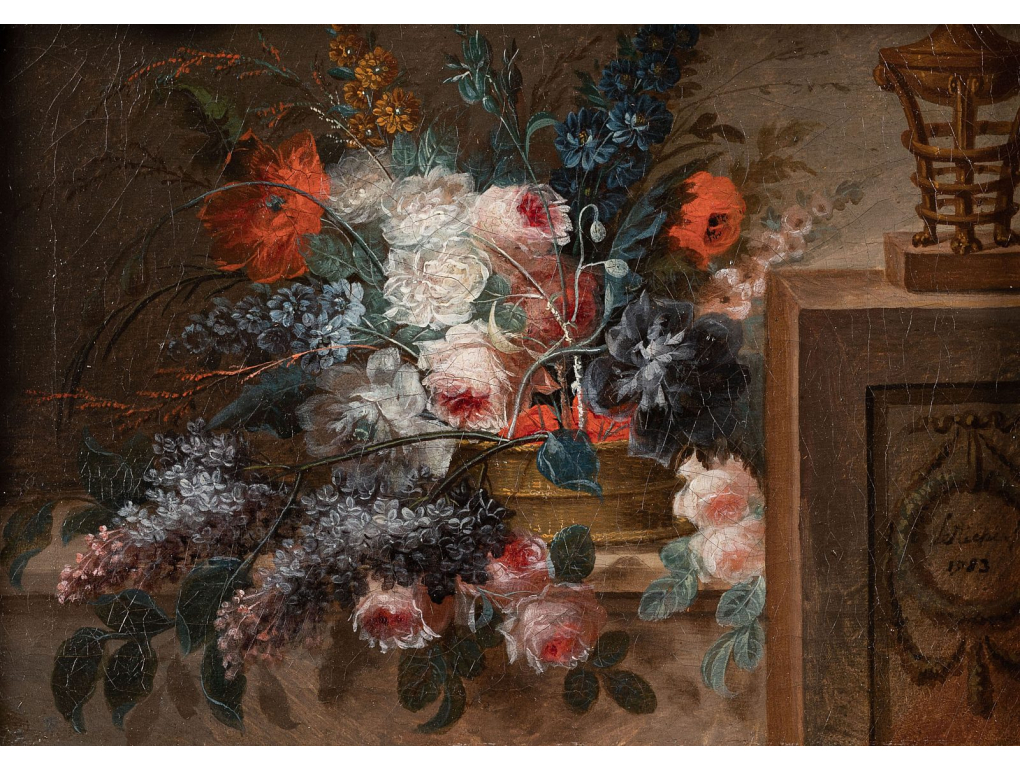 Dans cette nature morte florale, Pierre Leriche illustre la rigueur et le raffinement propres à la peinture de fleurs de la fin du XVIIIᵉ siècle. Le bouquet, composé de roses, pavots, lilas et fleurs bleues, est disposé avec équilibre sur un entablement de pierre, dans une mise en scène claire et structurée.Lire la suite